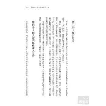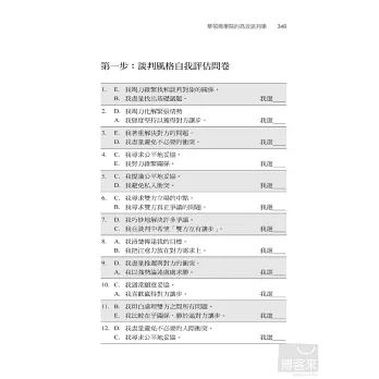 作者於是根據談判各造所認知的「未來關係重要性」,以及他們所認知的「利害關係衝突強度」,將情境分成四個象限,整本書就根據這四個象限的特性與需求,發展出不同的談判策略。這些策略又都建築在包括「個人談判風格」在內的六個談判基礎之上。六個基礎就像六根支柱,支撐起作者整個談判的戰略體系。這讓這本書讀起來很有系統,讀者可以按部就班,循序漸進地增進自己的談判智能。