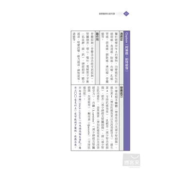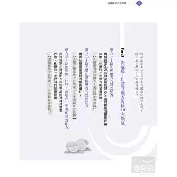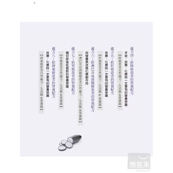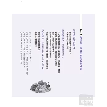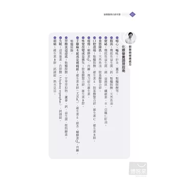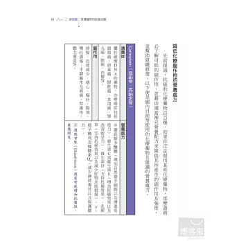 不管是平時的防癌保健,或者抗癌時要增進體力、提升療效,甚至療程後避免復發,營養醫學都扮演非常重要的角色。針對這些可防癌、抗癌的八大類營養素,書中化繁為簡地介紹了其在營養學上的機轉,讓你了解為何大部分癌症患者都需要補充硒酵母、天然魚油等,而不同的癌症患者又要加強補充哪些營養素,像是肺癌患者可以多補充綠茶素、大腸癌患者需補充大蒜精等等。而在治療前後,要改善或避免一些副作用和後遺症,營養素也是不可或缺的好幫手,例如:喝薑茶、補充麩醯胺酸,能改善化療帶來的噁心、嘔吐症狀;進行高劑量化放療時,特別容易發生口腔潰瘍,補充維生素B群、優質蛋白質、維生素C或麩醯胺酸等營養素,不但有助於潰瘍傷口的癒合,也能防止患者營養狀況惡化等等。
