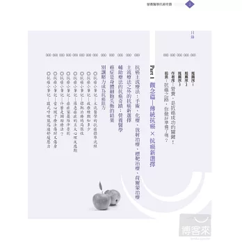 更難能可貴的是,作者詳盡細膩地說明了目前主流癌症療法的進行方式、不同的癌症期別判定、常見的副作用和後遺症,以及營養醫學在這些治療上能發揮的強大效用。掌握了這些最新的重要資訊,就能跳脫一般患者和家屬被動等待醫師指示的角色,積極與醫師做更深入的溝通,選擇對自己最好的抗癌療法。