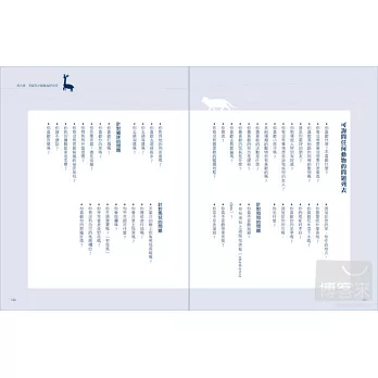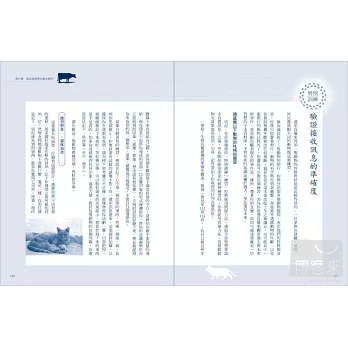 好消息是,重啟管道並非遙不可及。坊間有不少溝通師便是透過後天學習,成功建立起與動物雙向溝通的連結,本書作者瑪塔.威廉斯正是其中之一。她認為動物都是直覺大師,只要跟隨書中練習題一步步培養直覺感應力,複製她的能力指日可待。此外,她也分享了化解動物心結、改善動物行為、遠距協尋走失動物,以及與已故動物聯繫的經驗談,就連打開動物話匣子的聊天題庫也都貼心奉上。她語帶鼓勵地表示:「我開班教授直覺溝通超過十年,還沒遇過有誰學不會。」