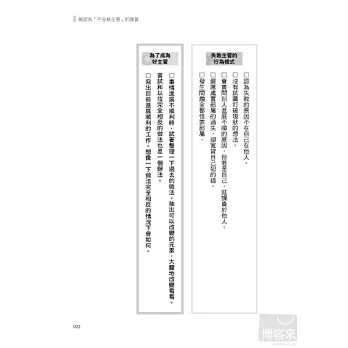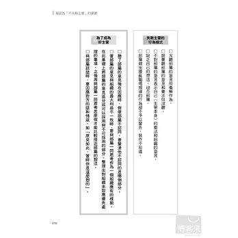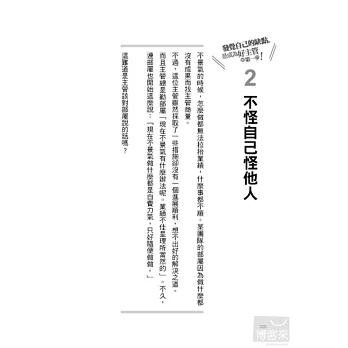 先將全書流覽一遍,若有自己欠缺或感覺別人正是如此評價自己的部分,請試著在閱讀時一面自我覺察。發覺自己的缺點是成為更好的主管的第一步。讓我們持續不斷地改進吧。