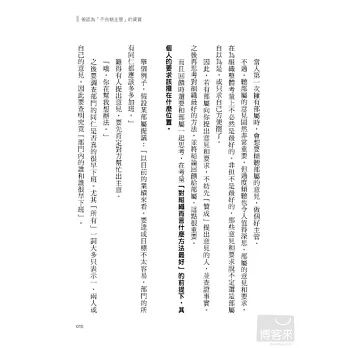 他發現,想成為好主管並沒有固定的規則可循,但失敗的主管,卻有共通的毛病。在收集整理了5000多件親手接觸的案例,並加上自己過往的經驗後,他歸納出「想當好主管,一定要重新檢視的50件事」。