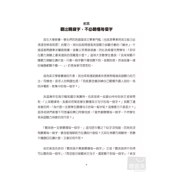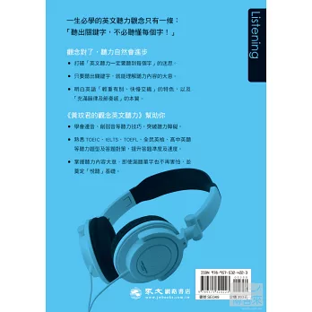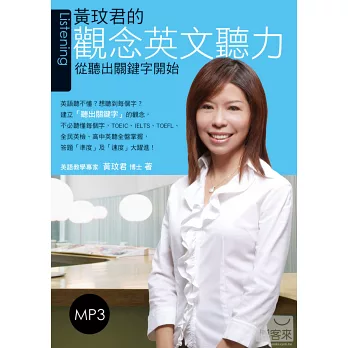 作者黃玟君老師任教於國立台灣科技大學應用外語系,經常被學生問到聽力測驗拿高分的祕訣,也常在演講時遇到英文老師詢問如何幫助學生聽懂英語。在多年的學術理論及實際教學的互相印證下,她深覺國人的英語聽力無法進步,追根究底,多半是因為「觀念」不正確,以致於一味追求「聽英語一定要聽懂每一個字」。