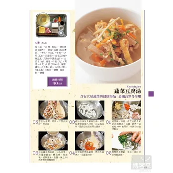 湯品也充滿了營養。用燙或蒸等方法料理時,食材中的維他命和礦物質很容易流失;但是只要煮成湯,便能將養分完全保留在湯汁中。此外,利用各種不同食材熬煮而成的湯品,含有豐富的營養素,方便消化與吸收,最適合身體不適的時候食用。例如韓國料理中著名的人蔘雞湯或韓式海帶芽湯,自古以來就被當作婦女產後調養身體的補品。