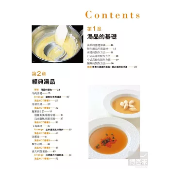 湯品雖然不如主菜那麼搶眼,但卻是一餐中不可或缺的料理。以蔬菜與肉類燉煮的簡單湯品,只要再勾芡或用果汁機打勻,便能變化出各種不同的滋味——這正是湯品的魅力之一。