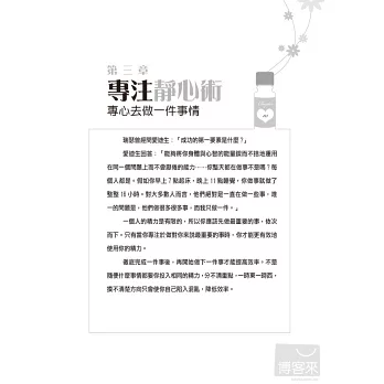 瑞瑟曾經問愛迪生:「成功的第一要素是什麼?」愛迪生回答:「能夠將你身體與心智的能量鍥而不捨地運用在同一個問題上而不會厭倦的能力……你整天都在做事不是嗎?每個人都是。假如你早上7點起床,晚上11點睡覺,你做事就做了整整16小時。對大多數人而言,他們肯定是一直在做一些事,唯一的問題是,他們做很多很多事,而我只做一件。」