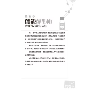 體能靜心術認為,身體是心靈的依托。要想讓我們的心靈處於一個無壓狀態,首先我們應該擁有一個健康的身體,有一個健康的精神狀態。