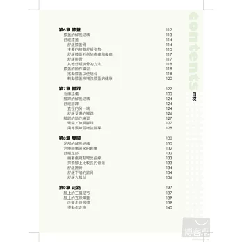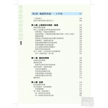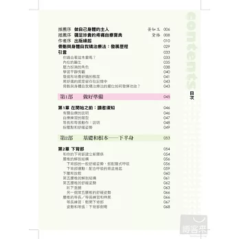 在書中的第四部,作者還很貼心的介紹了坐骨神經痛、脊椎側彎、拇趾外翻、失眠、慢性疲勞等,現代人最容易出現的特殊狀況,平常大家最關心的問題,在最後這個章節都能夠找到解決的答案,相信學會之後,無論是對自己或是對家人,都會有很大的幫助。