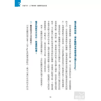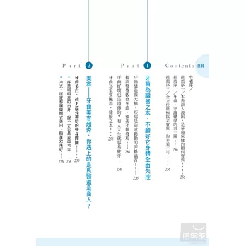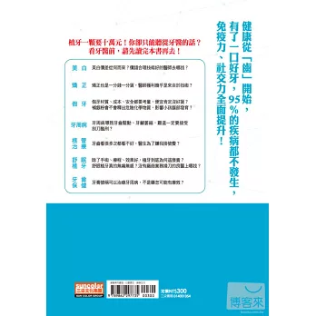1.真正以病人關心的議題為出發:本書由專業植牙權威醫師,從大家最關心的牙齒疾病、兒童牙齒問題、矯正美白、清潔保健到牙科迷思,全都告訴你。