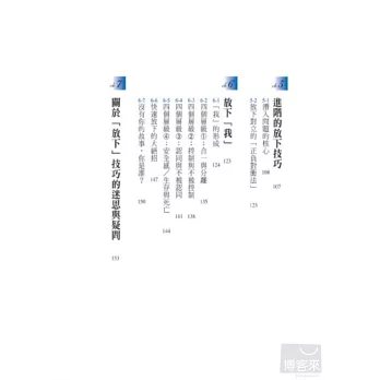 如此看來,本書的內容的確值得你一讀再讀;而書中章節裡所附帶的相關「放下」練習部分,更是本書超值之所在。一切就只等待著你的品味鑑賞;還有來自你將真實生活裡所碰到的「實例」,置於本書的「練習」之操作和親身體會。