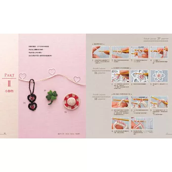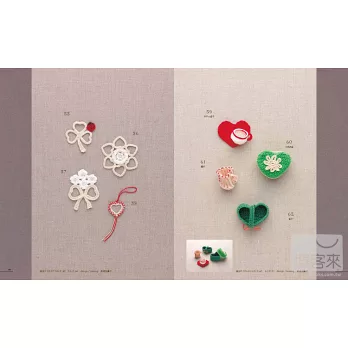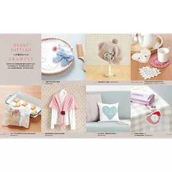 除了傳統的心型之外,書中還有變成以心型編織成的花瓣造型、幸運草造型,或是用於滾邊的織帶,有的平面、有的立體,妳也可以自由創作與運用,變出更多花樣。本書提供15招可活用於生活週邊的美麗樣品、100種心型編織的點子與織法,讓我們一起將特別的心意灌注在心形手作物中,送給最想送的那個人吧!