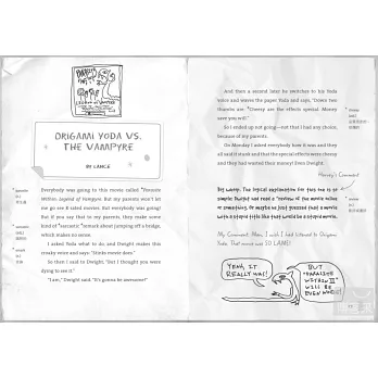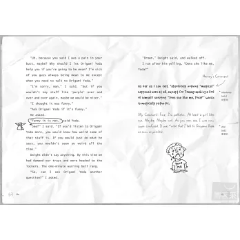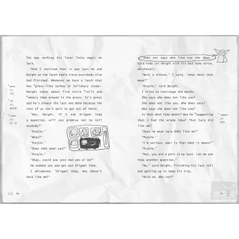 可是杜懷特能做一件很酷的事:他是個超棒的摺紙高手。有一天,他做了一個尤達大師的紙偶套在手指上,帶到學校來。然後,神祕的事就不斷發生。紙尤達可以預知未來,在碰上尷尬、麻煩、困擾的時候他會告訴同學該如何解決。他的建議非常有效,而且總是有出乎意料的驚人結果。很快的,同學們一個接著一個排隊來向大師請教。