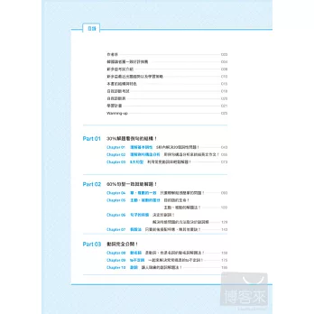 每個章節前除了再次複習前一章所提到的概念和祕訣之外,還有預習該章會學到的觀念和技巧。在進入文章之前先有心理準備,也能驗證和測試自己的英文實力到哪一個階段。