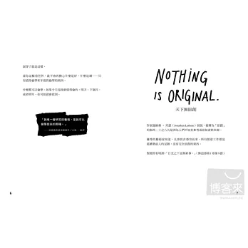 這本書揭露了創意的真相:沒有什麼是原創的,所以不要害怕受到影響,從別人的作品中學習,混合之後成為另一種面貌,藉此走出自己的路。跟著自己的興趣走,有些看起來像是興趣的事情,可能會成為你終身的志業。別再管那些陳腔濫調,說什麼「寫你知道的東西」,而是要「寫你想讀的書;拍你想看的電影」。