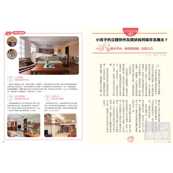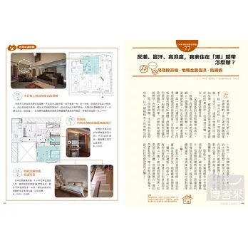 書中從各種家空間的煩惱出發,列舉出100個最常見的生活困擾,分為【使用機能】、【空間及動線】、【家族成員】、【品味嗜好】、【關於健康】,【生活創意】六大煩惱,將這些最基本也最惱人的問題,第一次透過專業總動員,由設計師、工班、家事達人、居家建診達人,與建材設備專家等,給予最多元與最實際的建議,逐一解答居家難題,讓你的居家觀念、設備與常識,再升級!