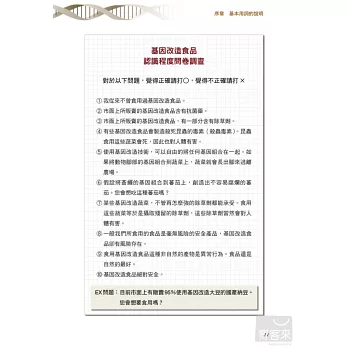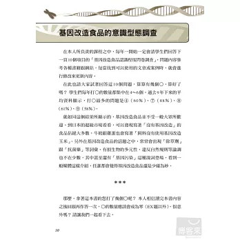 作者認為,各位必須擁有對於「基因」跟「蛋白質」的基本知識,並透過「科學性的思考」,才能正確地判斷生活周遭的各種商品是否真的有害及有利。千萬不要被片面的報導或一些不完全正確的資訊誤導,甚至沒有吃過就一心厭惡。