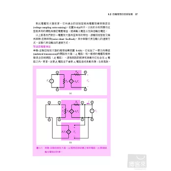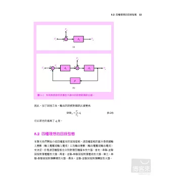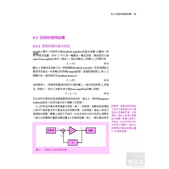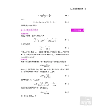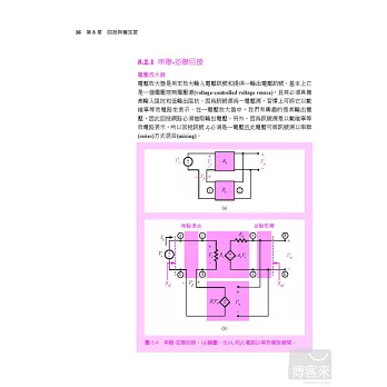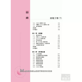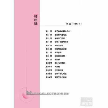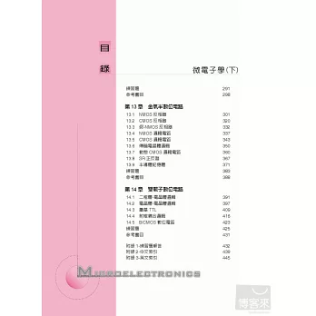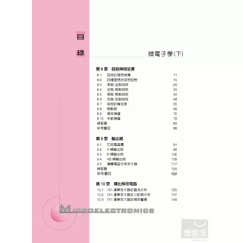 下冊內容如下:第8章介紹回授與穩定度,內容分為三部份--四種低頻回授組態的分析,以波德圖分析回授系統的穩定度,以及欲使回授系統在指定增益條件下穩定的四種頻率補償技術。第9和第10章分別為輸出級和類比積體電路,包括三種基本輸出級的特性分析,741運算放大器內部電路分析,CMOS和串疊式CMOS運算放大器,D/A和A/D轉換器。第11章是濾波器,分析的電路計有七種被動式LRC濾波器,無電感的多級放大器二階濾波技術,單一放大器二階濾波器以及切換電容技術。第12章介紹波形產生器,包括正弦振盪器,雙穩態複振器,以及分別利用opamp,555計時器和CMOS合成的多種無穩態與單穩態複振器電路。第13章是金氧半數位電路,內容論及各式NMOS反相器,假NMOS和CMOS反相器,NMOS和CMOS邏輯電路,NMOS和CMOS傳輸閘及動態CMOS邏輯。第14章為雙載子數位電路,包括早期邏輯電路之回顧及其演進,TTL、ECL和BiCMOS電路特性及應用。