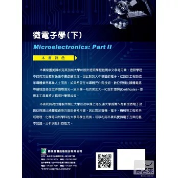 本書同時為台灣數所國立大學以及中國上海交通大學推薦作為教授微電子及數位與類比積體電路等方面的參考用書。因此對於電機、電子、機械等工程科系或物理、化學等自然學科的大學部學生而言,可以利用本書培養微電子方面的基本知識、分析與設計的能力。