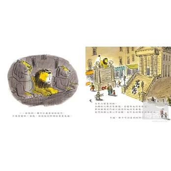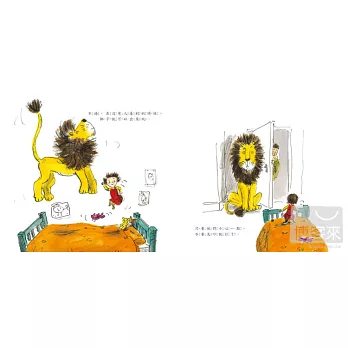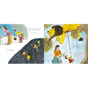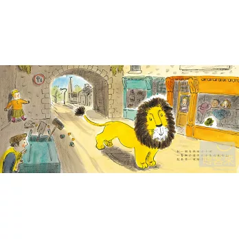 鎮上的人都很怕獅子,他們拿起掃把、擀麵棍…把獅子趕得遠遠的。獅子跑啊跑,跑到小女孩愛麗絲的花園裡。