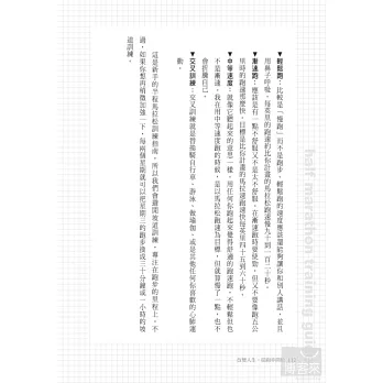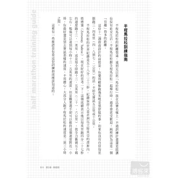 於是,從5公里路跑、半馬到全程馬拉松,甚至擴大到鐵人三項運動,班的目標逐步達成。他蒐集了正確的訓練守則,以及實際參賽的體驗,在書中鉅細靡遺的跟讀者分享,整本書也等於是他一年以來的跑步日記。