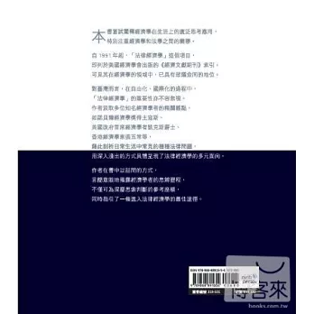 對臺灣而言,在自由化、國際化的過程中,「法律經濟學」的重要性亦不容忽視。作者汲取多位知名經濟學者的精闢觀點,如諾貝爾經濟學獎得主寇斯、英國政府首席經濟學者凱克斯爵士、香港經濟學家張五常等,藉此剖析日常生活中常見的種種法律問題,用深入淺出的方式具體呈現了法律經濟學的多元面向。