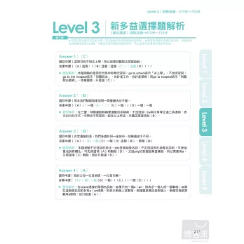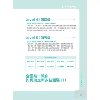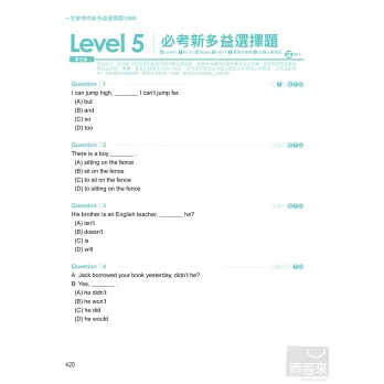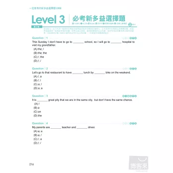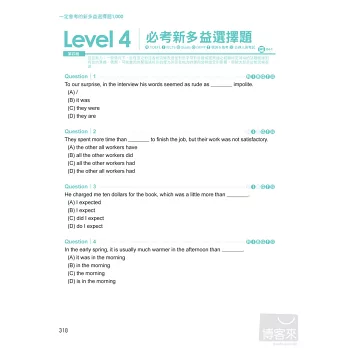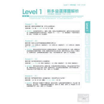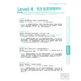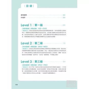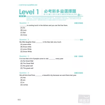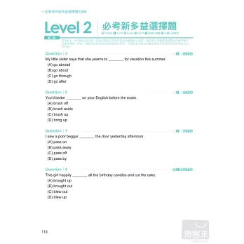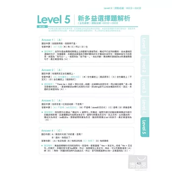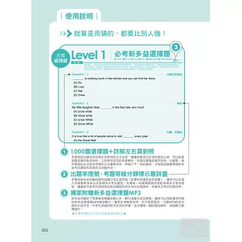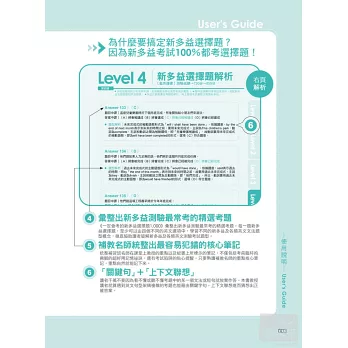 別以為不是正確答案的選項就不重要,許多錯誤的文法觀念正是新多益測驗及各類英文考試的範圍內容,完整且正確詳細的解析才能讓讀者及考生徹底瞭解選項為何錯誤,讓讀者及考生不會一錯再錯。《一定會考的新多益選擇題1,000:就算是用猜的,都要比別人強!》內容編排將題目與答案解析用左右頁對照的方式呈現,讓讀者及考生作答完左頁的題目之後,趁著對題目印象深刻時,立刻對照右頁的答案、中譯及詳解,徹底瞭解並吸收補充內容後,再進行下一頁的練習。用循序漸進的方式練習新多益選擇題,才能真正融會貫各式考題類型和文法重點。