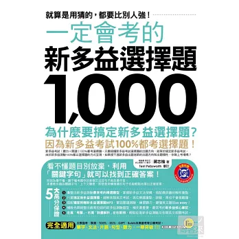 只要是考試,都會遇到猶豫不決、無法下決定填寫答案的時候,《一定會考的新多益選擇題1,000:就算是用猜的,都要比別人強!》教你利用「消去法」、「直覺判斷法」立刻寫出答案,就算是沒有把握的題目,用猜的都比別人強。