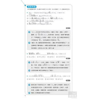 增加口語用法及慣用句、諺語等:因為新日檢的測試目標明確訂定為「測驗學習者的日語溝通能力,以及是否能利用該能力來解決各種生活上實質的問題」,為了提高實用力,新日檢出現許多比較口語的用法及慣用句、諺語等,針對此項目標,本書增加收錄了口語上的用法及慣用句、諺語等,讀者準備起考試可以更為周全。