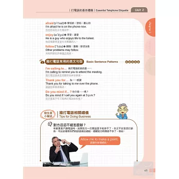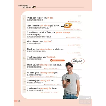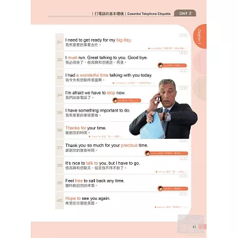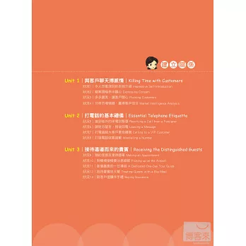 書中30個單元中,每單元都有40句基本會話,全書共1,200句。做生意會用到的英文並不多,只要把這幾句記熟就可以了。另有貼心提示,補充說明句中的關鍵單字。聽MP3同步學習,可學會句子的正確發音。