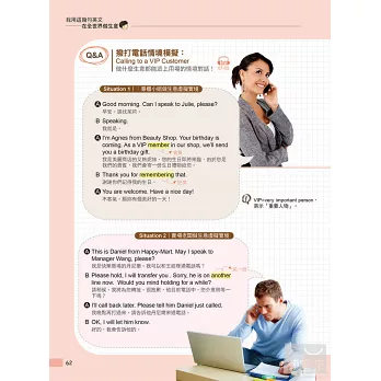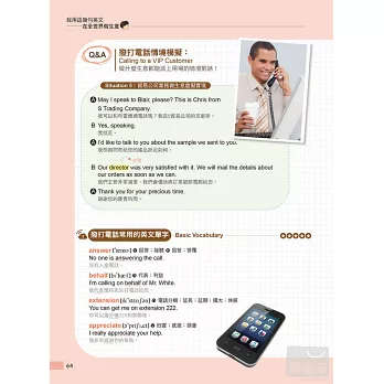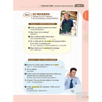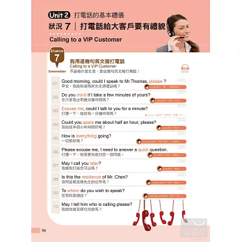 每單元共5組範例,為各行業人士提供實用範本。例如關於「多多讚美,讓客戶開心」這個單元,便收錄了「地攤老闆、餐廳老闆、計程車司機、專櫃小姐、貿易公司業務」這5組讚美客戶的虛擬實境。對照MP3,學習效果更佳。