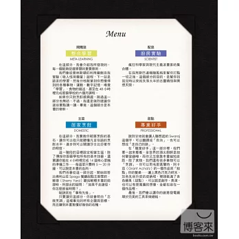 作者向世界頂尖主廚及各領域的佼佼者請益,濃縮成14堂「精實的」基礎烹飪課程(每道食譜都不超過4種食材),14種可以在自家廚房進行的分子廚藝,還有米其林餐廳常用的6項技巧及10項準則。不論你是廚房菜鳥還是資深老饕、科學宅男或家庭主婦,都可以在這本書裡找到你想要的東西。