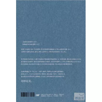 本書精選日本民藝之父柳宗悅講述民藝運動的理論基礎,為「何謂民藝」做定調,歸納出美的定義及構成美的條件,釐清民藝與藝術在功能性、美的評判標準上之不同,影響此後近百年日本人的生活態度,也在無形中培養出日本民眾的美感意識,內化成無法計量的精神資產。現今正在台灣發酵的生活道具風潮可說是當年日本民藝運動的延伸。