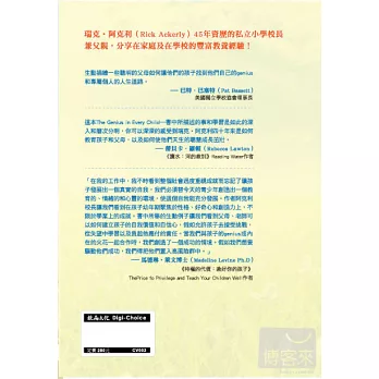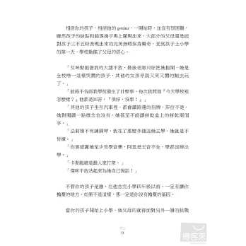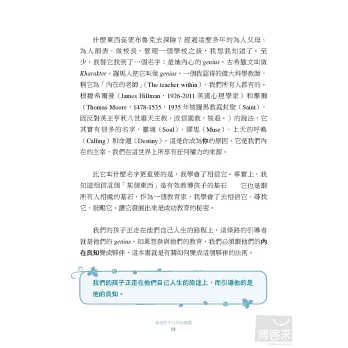 Genius還有很多內心抽象的意義在,是指一個人的天性、才能、創造力、內在真知或是好奇心;而牛津字典2001年版的第五項對於Genius一詞註釋:一個人、地方或組織團體的守護神。翻開此書,一起學著引導出孩子心中的genius,心中的小精靈!