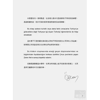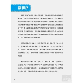 本書的內容,不僅僅只是「你好」、「謝謝」和「再見」這麼簡單,它還涵蓋了土耳其日常生活中的大小事。我認為它不但適合去土耳其短期旅遊的人(尤其是背包客族群),也相當適合因工作或是就學將長期居留的人用來自學,因為此書對於融入當地生活絕對會有很大的幫助。