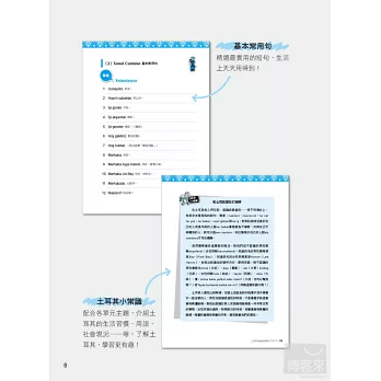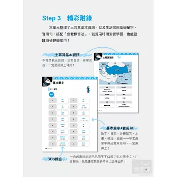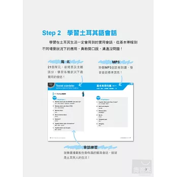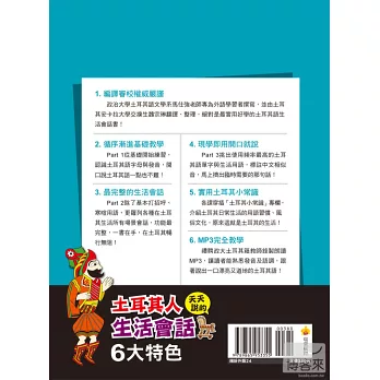從基本的打招呼常用句開始,接著銀行篇、餐廳篇、飯店旅館篇、超市篇、醫院篇、美髮沙龍篇、旅行篇、社交活動篇、興趣嗜好篇……等21個生活實用場景,在實際應用中練習土耳其語會話。