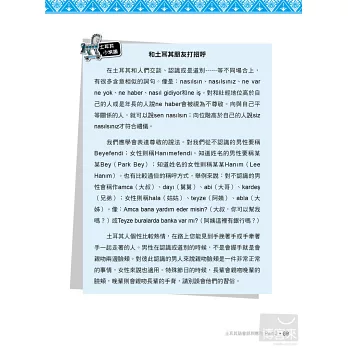 5.實用土耳其小常識:各課穿插「土耳其小常識」專欄,介紹土耳其日常生活的用語習慣、風俗文化,原來這就是土耳其的生活!