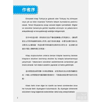 您手中的這本書,將有助於完全不懂或是略懂土耳其語的人,讓他們前往土耳其與土耳其人建立溝通的橋梁。本書概括了能應付基本需求的知識,而這些單字與知識完全包含在日常生活的範疇裡,並且簡化到適合外國人理解和開口的程度。