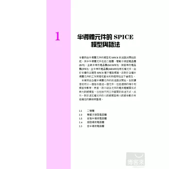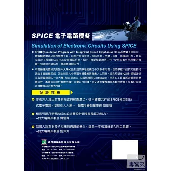 SPICE(Simulation Program with Integrated Circuit Emphasis)已經成為微電子領域中,電腦輔助電路分析的標準工具。目前在世界各地,包括北美、台灣、中國、南韓和日本,許多IC設計工程師均以SPICE從事電路分析、設計、模擬和驗證等工作。使用本書可使所學的微電子知識與市場結合、增加職場競爭力。