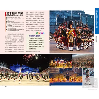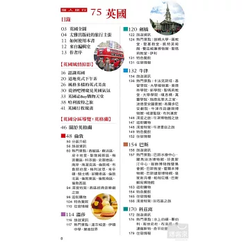 分別介紹英國各區,英格蘭、威爾斯、蘇格蘭,各區內不能錯過的熱門景點及必吃餐廳,還有實用的「交通、聯絡資訊」、「門票資訊」、「開放時間」、「網站或聯絡MAIL」、「其他注意事項」。
