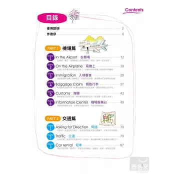 本書整理了17個出國最常碰到的情境,包括機場、交通和緊急狀況等,什麼情境說什麼話,分類清楚,暢行無阻,句句都是臨時救急的那一句話。