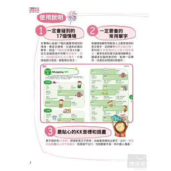 本書精心挑選17個出國最常碰到的情境,像是在機場、交通和吃喝玩樂等,將這17種情境分成4大篇,並在每個情境中列舉常用單字、例句、情境對話和生活小補充,什麼情境說什麼話,輕鬆學好英文。