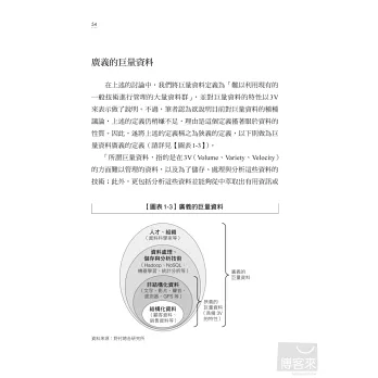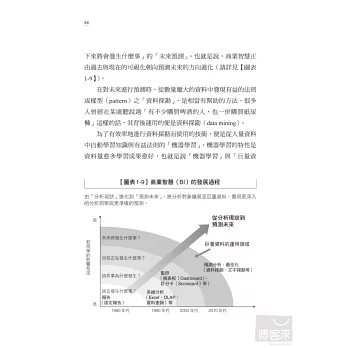 本書的內容在第一及第二章介紹了「巨量資料」在資訊科技技術上出現的許多新名詞,例如Hadoop、NoSQL、LOD 等;並且進一步解說企業在資料運用層面,從過去的「資料可視化」進展到「資料預測未來」的境界;因此,強調深層的資料調查以及準確度的預測,讓企業因為採用巨量資料的「技術」而進展到更高的境界。