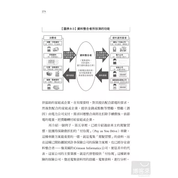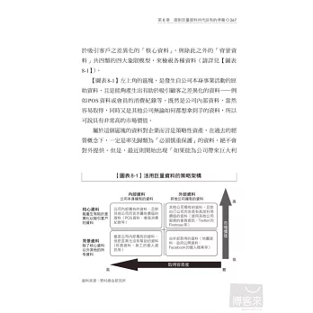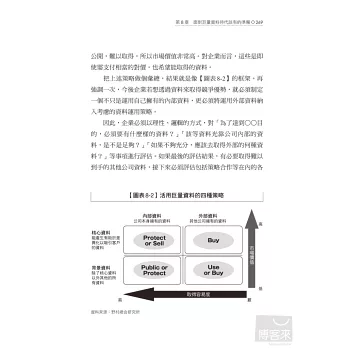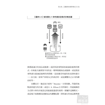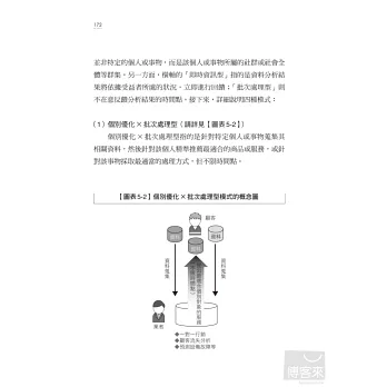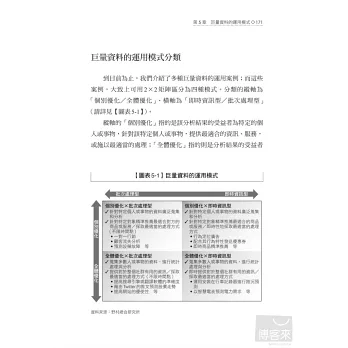 原本我以為這本書第三章與第四章完整介紹歐美日的八個企業案例之後,到此 應該夠了,但是,身為一位任職於全球知名智庫的管理顧問專家,如果只是把資料說個夠多,並沒有滿足提出「洞察力」(insight)這樣的專業標準,可能無法滿足讀者追根究柢的渴望。因此,我們可以看見第五章有13個巨量資料的運用案例,進一步介紹「將巨量資料引進企業,做為企業自我超越的契機」的具體樣貌。本書最令人讚歎的地方,在於作者將他研究企業應用巨量資料的成功案例,歸納成一張張淺顯易懂的圖表,其中,第五章【圖表5-1】巨量資料的運用模式,是一張相當精采的圖表,由個別最佳化、全體最佳化、批次處理與及時處理構成四種巨量資料運用的商業模式,滿足想要對於巨量資料獲利模式一探究竟的挑剔讀者們。