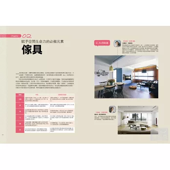 徹底詳解空間風格、居家配色、傢具挑選擺設、照明燈具、牆面桌櫃擺飾、織品窗簾等佈置原則,清楚掌握風格元素關鍵,空間用色及傢俱比例,擺設物品好看、好拿又好收的原則。