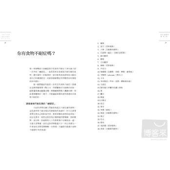 只要符合以上一項或是二至三項以上,表示你應該對某些食物有「不耐反應」。你會翻開此書,應該是知道或懷疑自己有食物不耐的問題,本書對食物不耐症有詳盡解說及改善方法,從「慢性疲勞」到「白色念珠菌」(鵝口瘡)、腸漏症、壓力太大、寄生蟲感染、腸躁症、暫時性記憶障礙(對熟悉的人事物突然想不出名稱)等,甚至像「濕疹」等各種皮膚狀況,或是氣喘這種反覆發生的問題都包含在內。