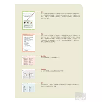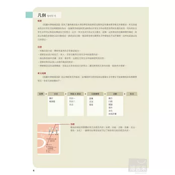 1.目標及引言 藉由詳細說明整體的單元目標及內容,在學習各單元前就可以了解各單元的目標以及內容。透過提問以及插圖,可以事先思考單元的主題,做好學習的準備。