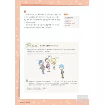 11.文化 介紹各課的主題與相關的韓國文化。以韓國文化的理解為基礎,將會更加理解韓語,也可以更自然地使用韓語。