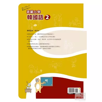 由韓國高麗大學韓國語文化教育中心編著、國立政治大學韓國語文學系朴炳善、陳慶智老師悉心翻譯、審訂。課程內容系統化,教學成果有口碑,是品質最好、最精良的韓語課本。