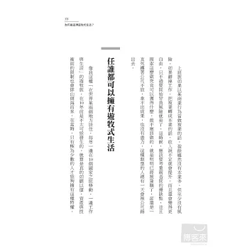 ★透過工作、金錢、生活、時間、思考的各方面訓練,由內而外打造全方位的遊牧式生活。