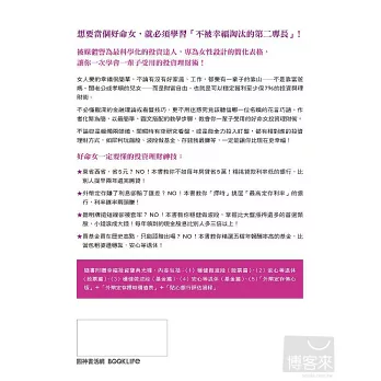 談錢很俗氣?是有一點;錢不能買到一切?也沒錯;一定有錢等於一定幸福?當然未必囉!但是各位姊妹們,只要你「有好多錢」,而且「一輩子都有錢」,代表你有能力去享受與選擇不同形式的幸福,而非被迫接受現實!亦即你當然可以「喜歡」住鄉下吃蘿蔔糕,但我更希望你「有能力」住華廈買柏金包,這才是本書的唯一重點,也是我未來對你最直接的幫助,就是讓你藉由投資理財,創造並累積出比現在更多的錢,讓你的未來可以比現在更幸福!